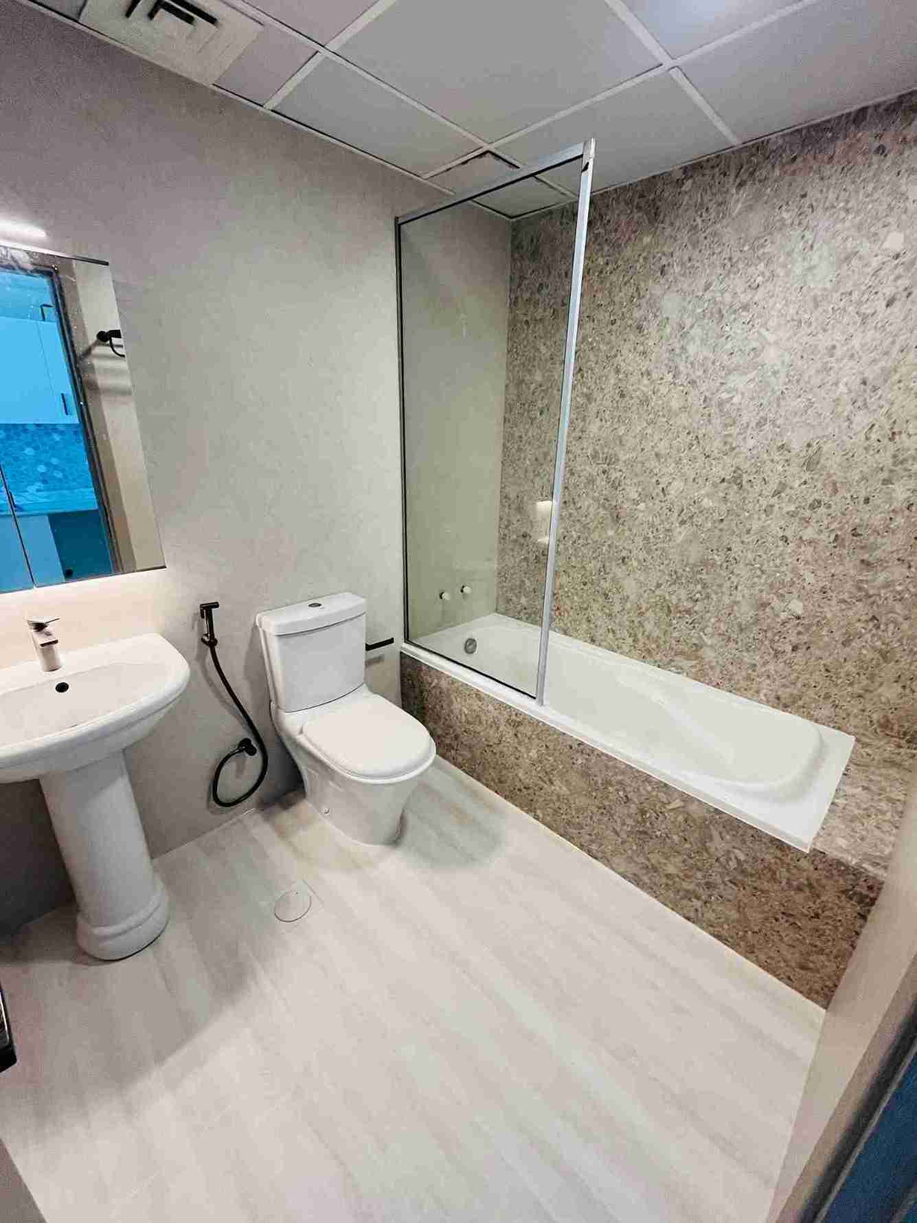 For the wrap to adhere properly and achieve a smooth finish, surface preparation is crucial. We start by thoroughly cleaning the bathroom surfaces to remove dust, grime, soap scum, oils, and any other residues that could affect the vinyl’s adhesion. At Lakeside Tower , we used specialized cleaning agents that are effective yet gentle, ensuring the surfaces were free from contaminants while avoiding damage. Any existing cracks, chips, or imperfections were filled or smoothed to create an even base for the vinyl.