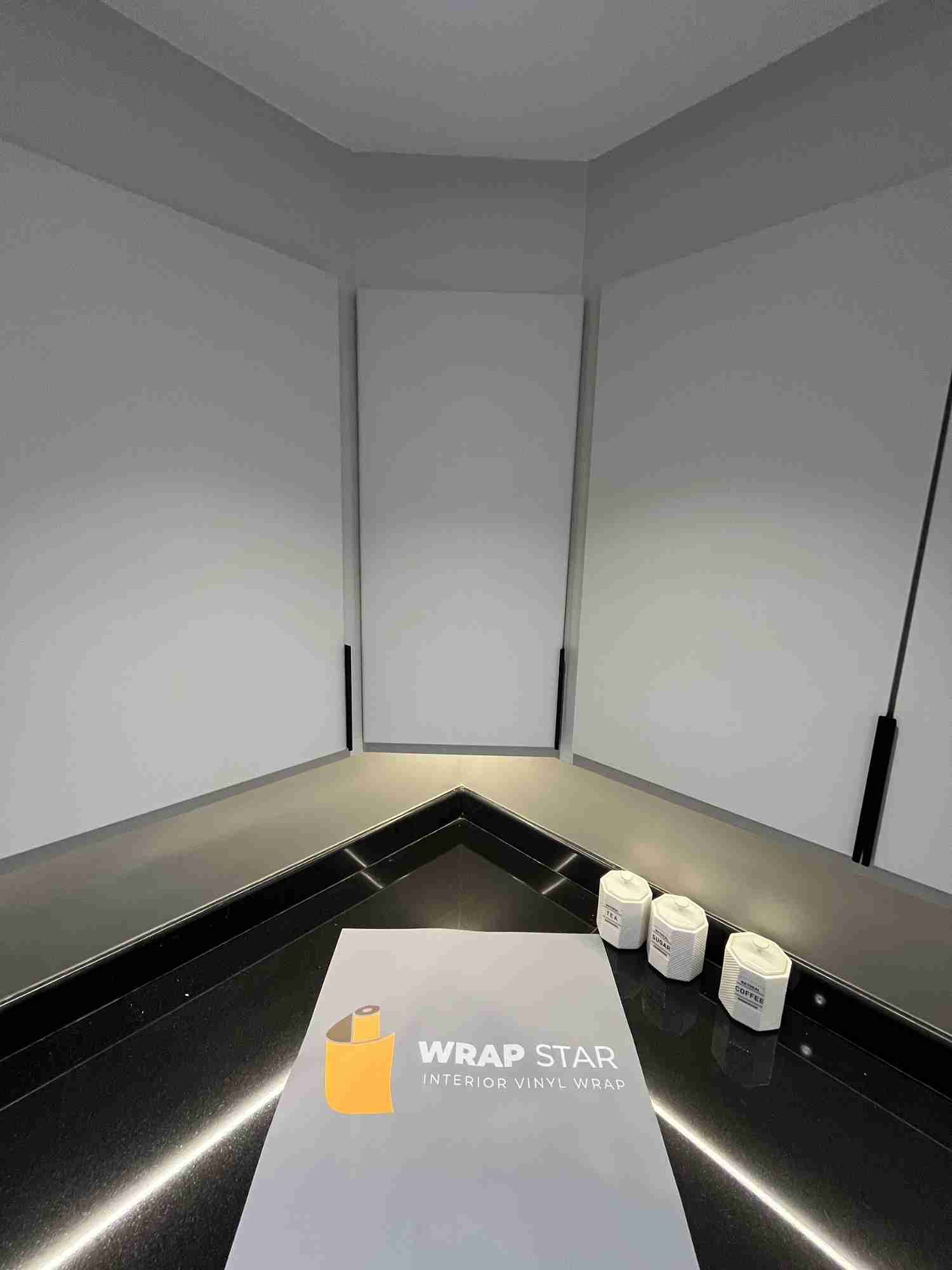 After reviewing several choices, the client opted for a matte grey vinyl wrap for the cabinetry and a glossy white wrap for the countertops. These selections were intended to create a balanced modern aesthetic, with the matte finish offering subtle sophistication and the gloss finish bringing a touch of brightness to the countertops.